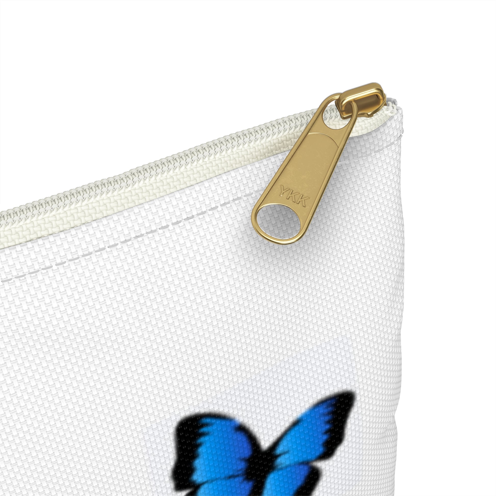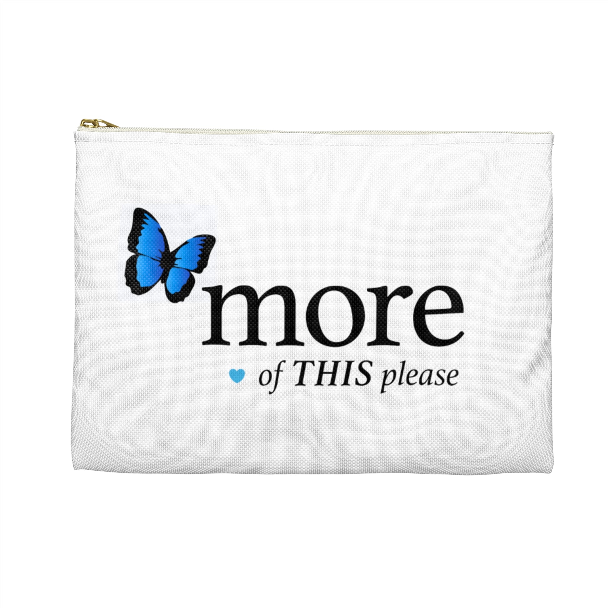 A lightweight, everyday accessory pouch designed to carry the little things that center you — chargers, lip balm, cards, and tokens of calm. The white spun-polyester surface holds crisp, vibrant printing so the small blue butterfly and understated “Recharge the SOUL” motif remain clear and soothing. A gold-tone zipper gives a refined pop while the interior laminate protects contents from light moisture. Slim and flat-cornered, it slips into a tote or sits on a nightstand as a gentle reminder to pause and recharge.